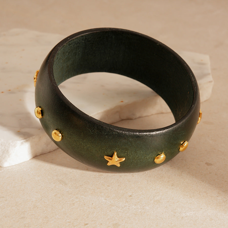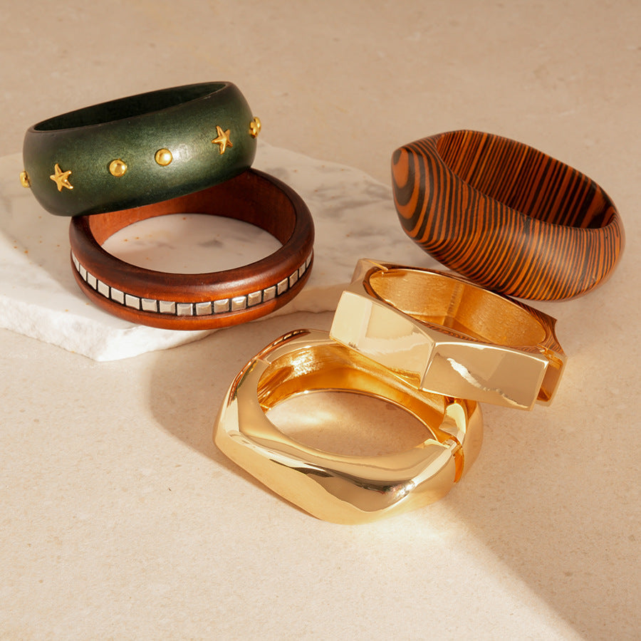 This is a beautiful and diverse set of bracelets, perfect for mixing and matching. The collection features two wide, chunky wooden bangles, each with a unique design. One is a deep, rich brown with a striking inlay of square silver accents, while the other is a vibrant green with small gold star studs. A third wooden bangle stands out with its eye-catching tiger-stripe pattern. Complementing these are two modern, sculptural gold-toned cuffs with a polished, reflective finish.