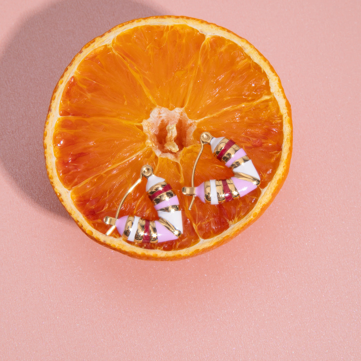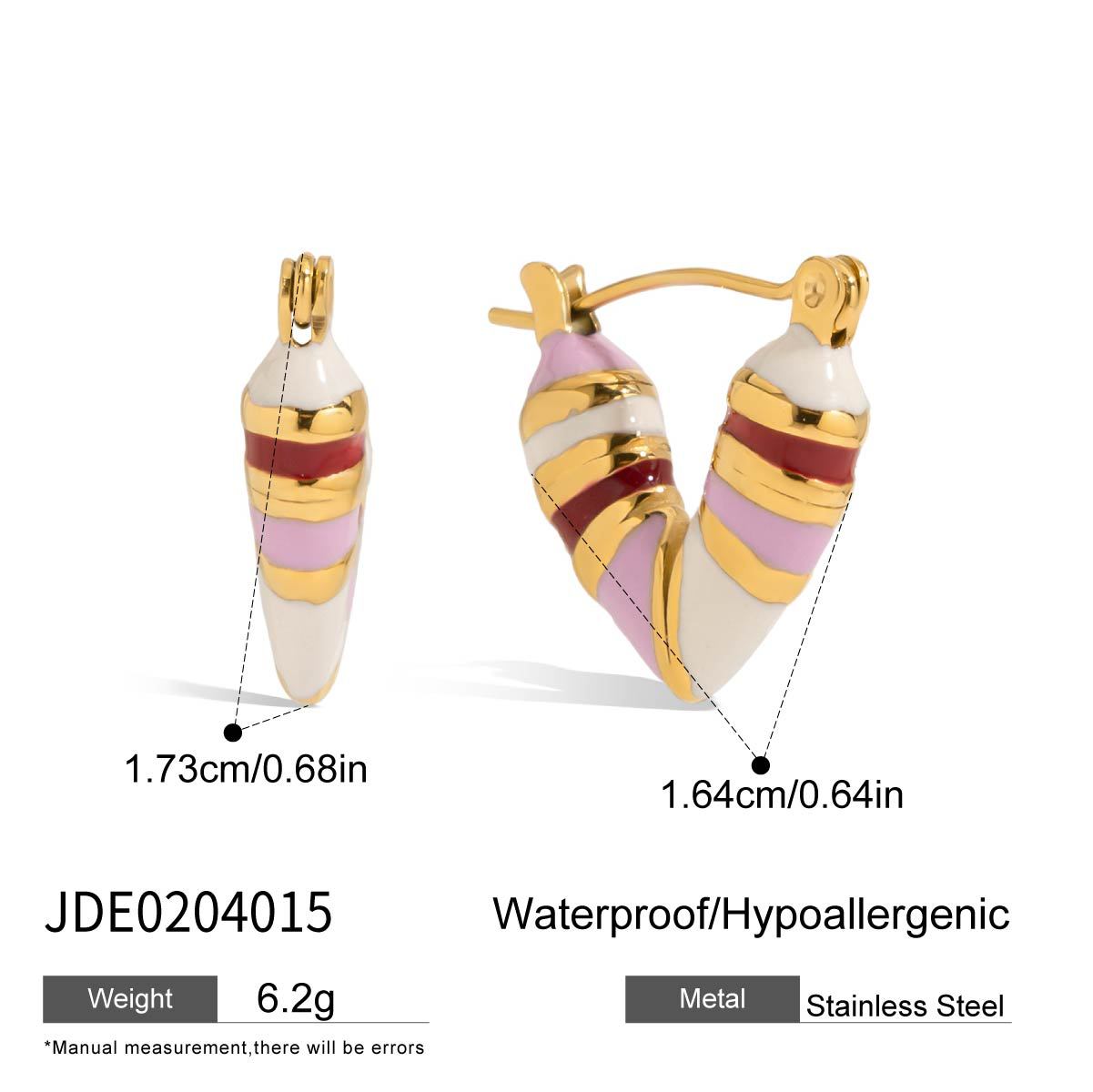 These charming hoop earrings feature a distinctive 'V' curved design, adorned with playful stripes in shades of pink, white, and gold. Their vibrant, hand-painted aesthetic adds a touch of whimsy and modern artistry to any look, perfect for a subtle pop of color and personality.
