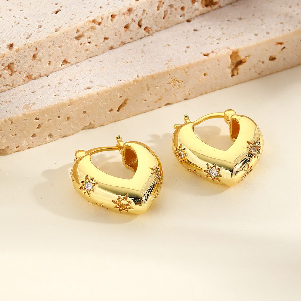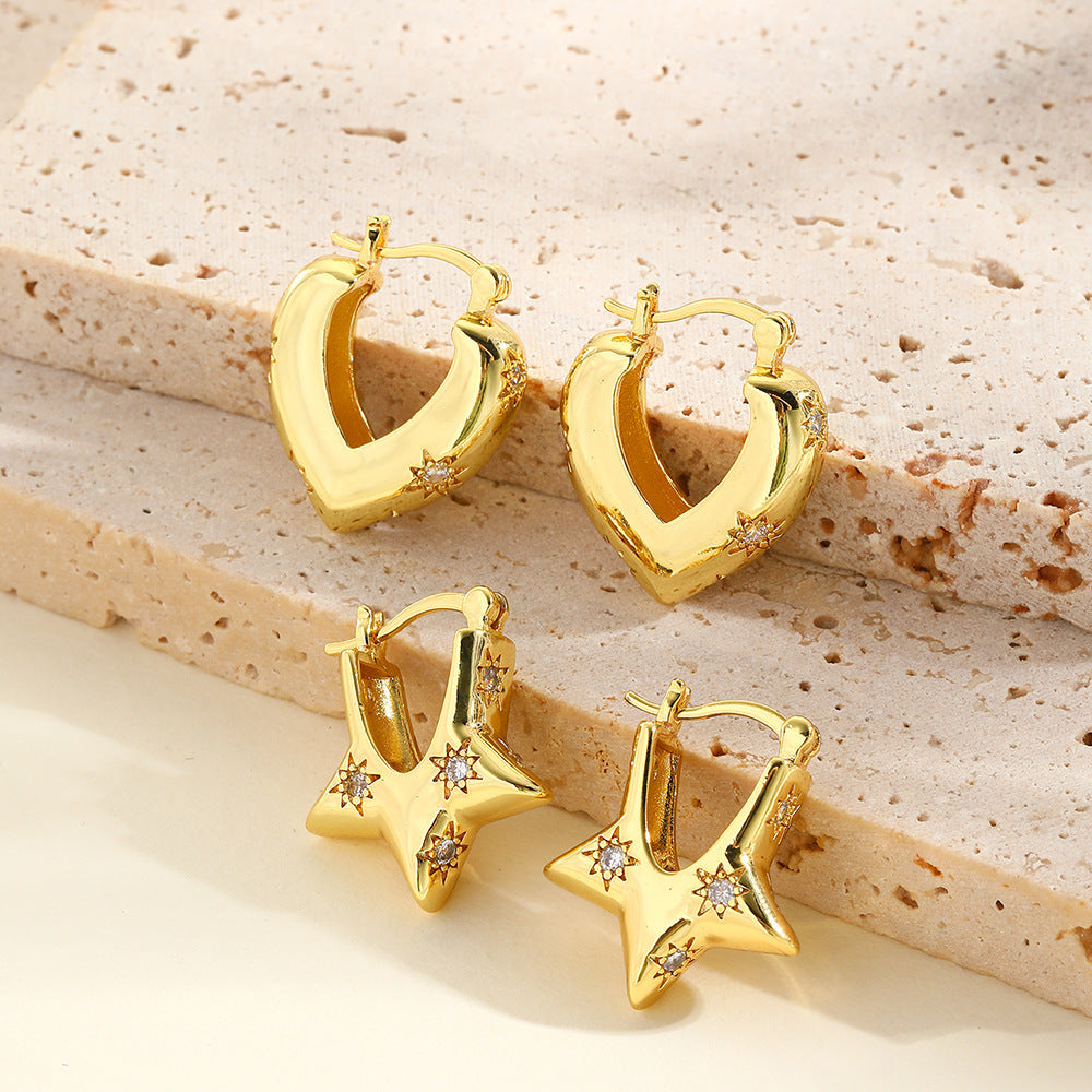 These are two pairs of chunky, gold-plated hoop earrings with a trendy, modern aesthetic. One pair is shaped like polished hearts, while the other features bold stars. Both designs are subtly embellished with small, sparkling cubic zirconia stones set in a starburst pattern, adding a touch of understated glamour. These versatile earrings are perfect for making a stylish statement.