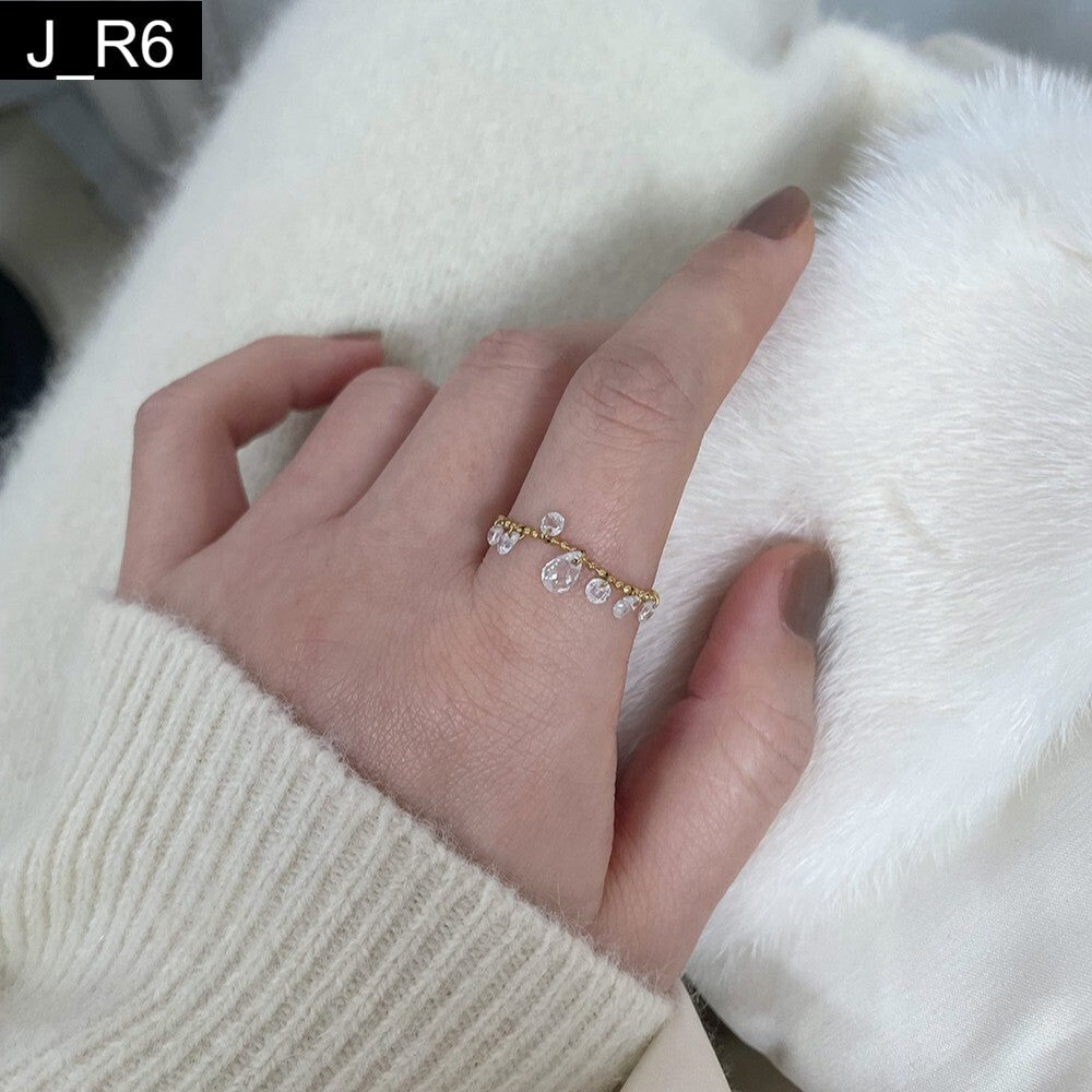 The Crystal Dewdrop Dangle Ring: A whisper of sparkle with every gesture. This delicate, unique ring features a fine gold-toned chain band adorned with multiple small, faceted crystal drops that shimmer and dance as your hand moves. The charming, lightweight design offers a subtle yet captivating effect, making it the perfect piece to wear solo or to add unique texture and movement to a simple ring stack.
