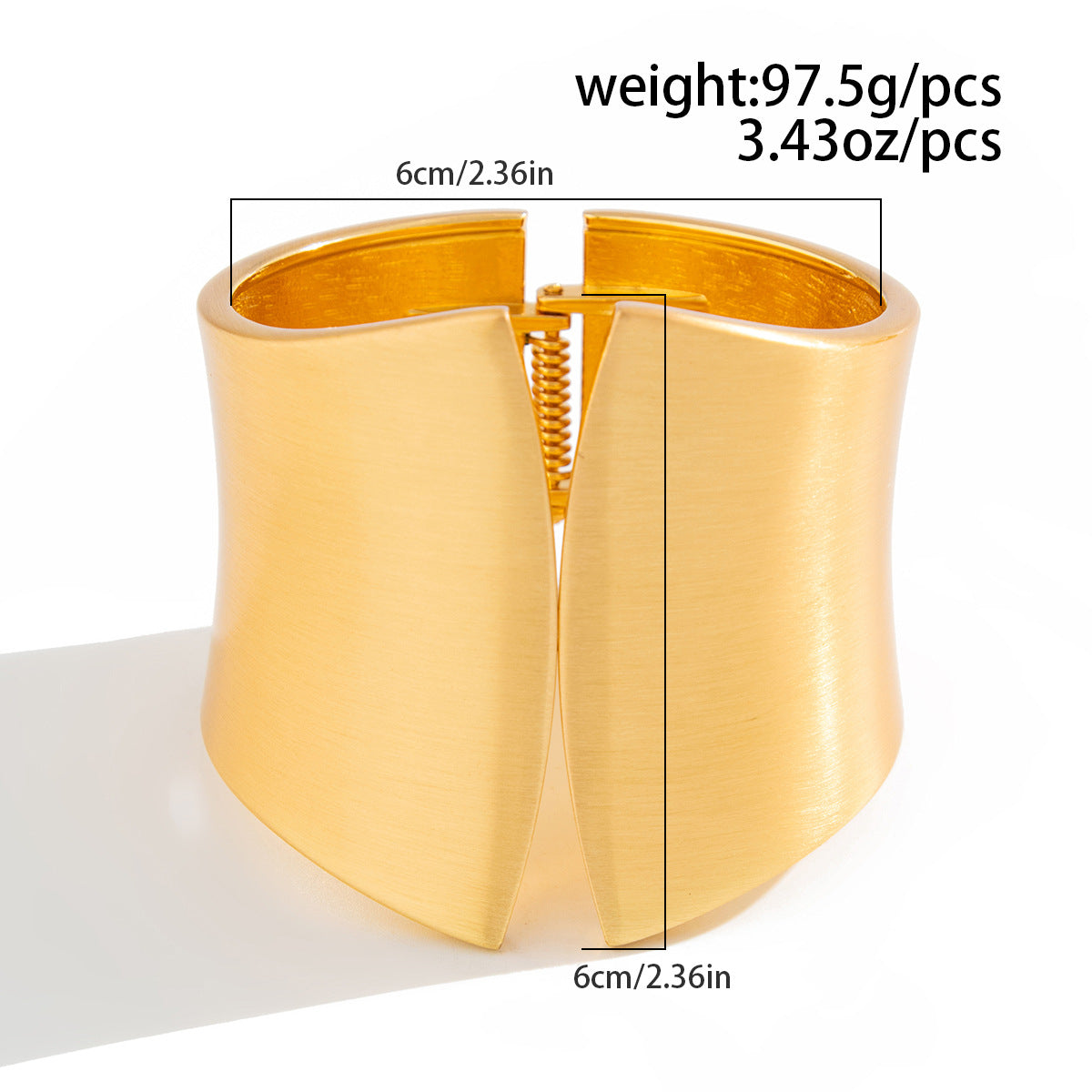 This bracelet set showcases a striking, modern design with a brushed, matte gold finish. The set includes two distinct pieces: a wide, sculptural cuff that features a captivating, undulating wave-like form, and a pair of open-ended bangles with a subtle concave curve, giving them a sleek, architectural feel. The combination of the different shapes and textures creates a sophisticated and contemporary look. The matte finish lends an understated elegance, making this set a perfect statement accessory for a minimalist yet bold style.