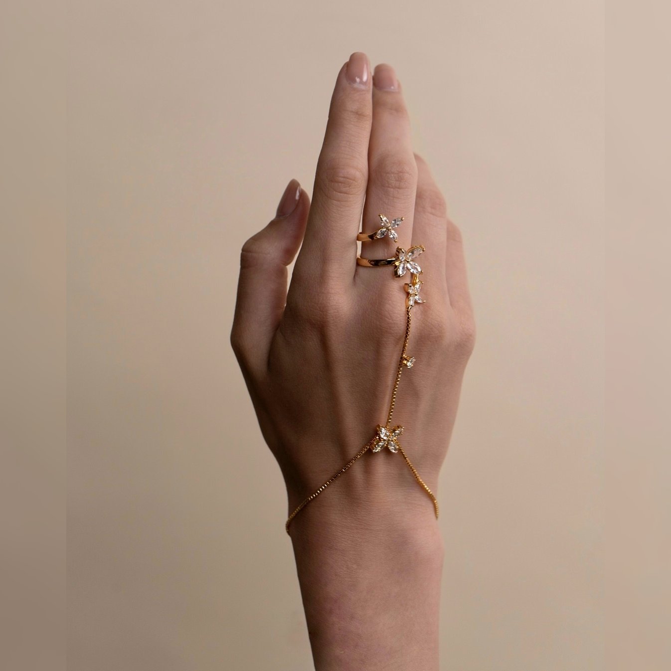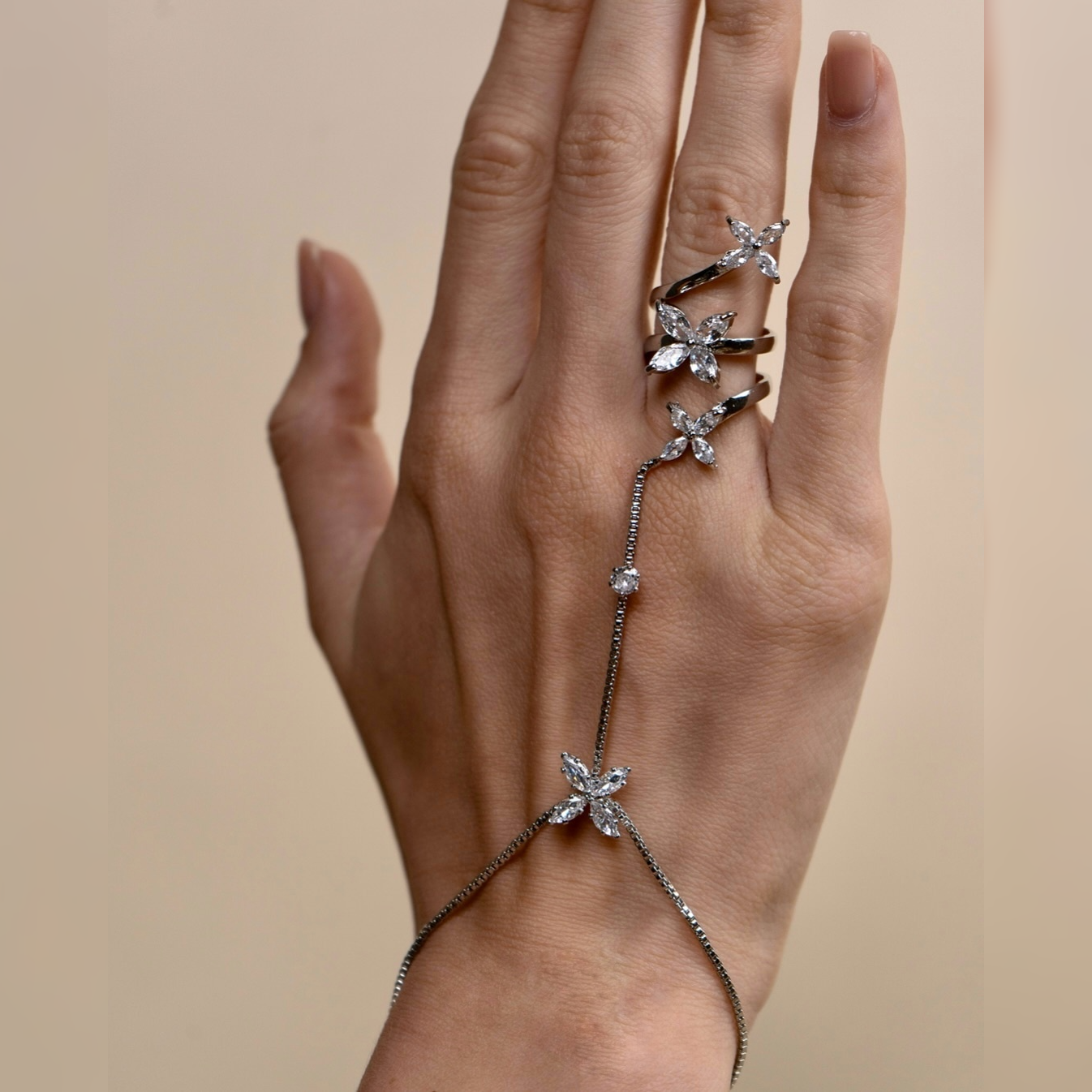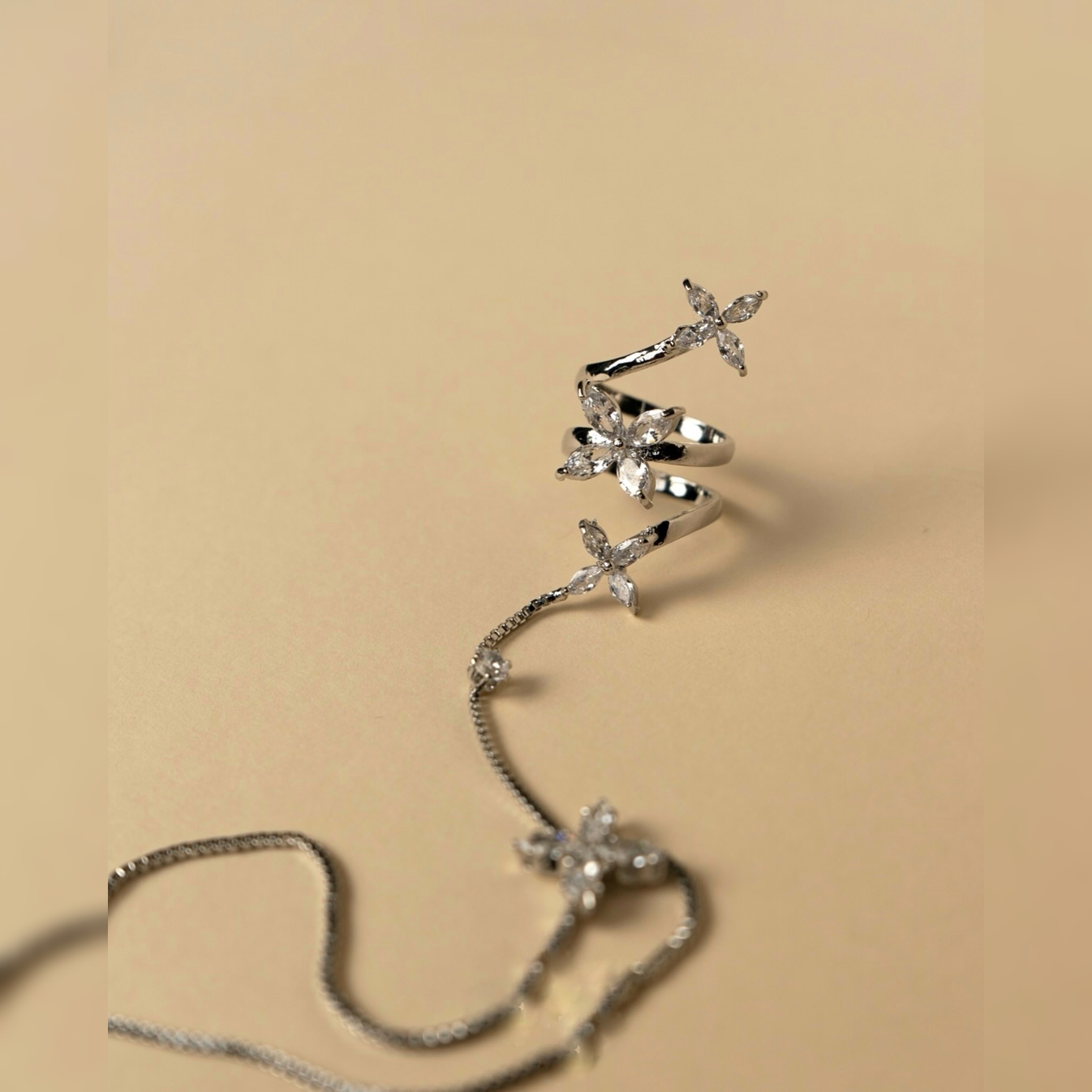 Embrace ethereal elegance with our Echo Flora Ringlet. This exquisite piece features a delicate chain that gracefully adorns your hand, connected to a ring adorned with sparkling floral motifs. Perfect for adding a touch of whimsical charm to any ensemble, this ringlet is a statement of refined femininity and unique style. Whether for a special occasion or to elevate your everyday look, let this be a whisper of delicate beauty on your hand.