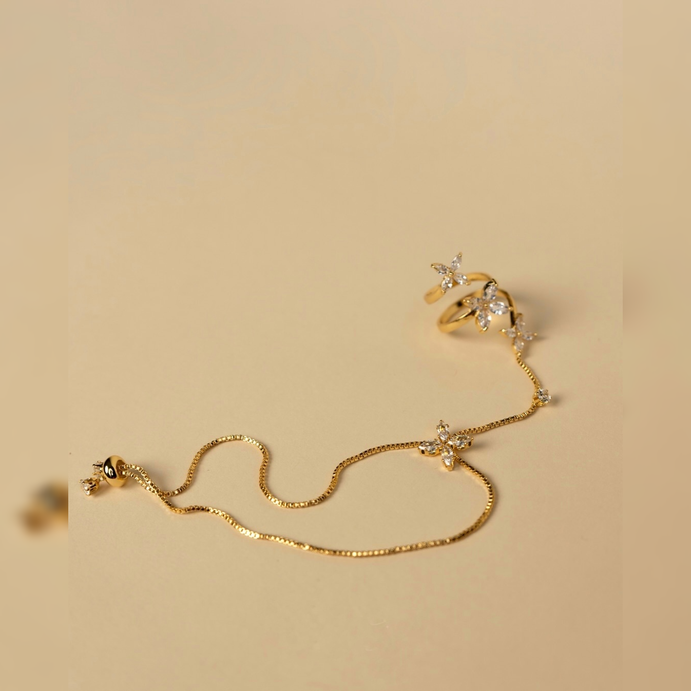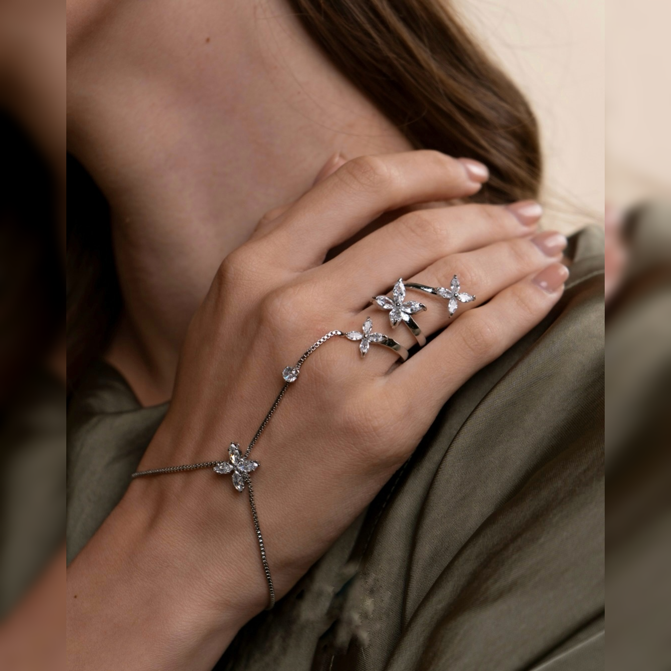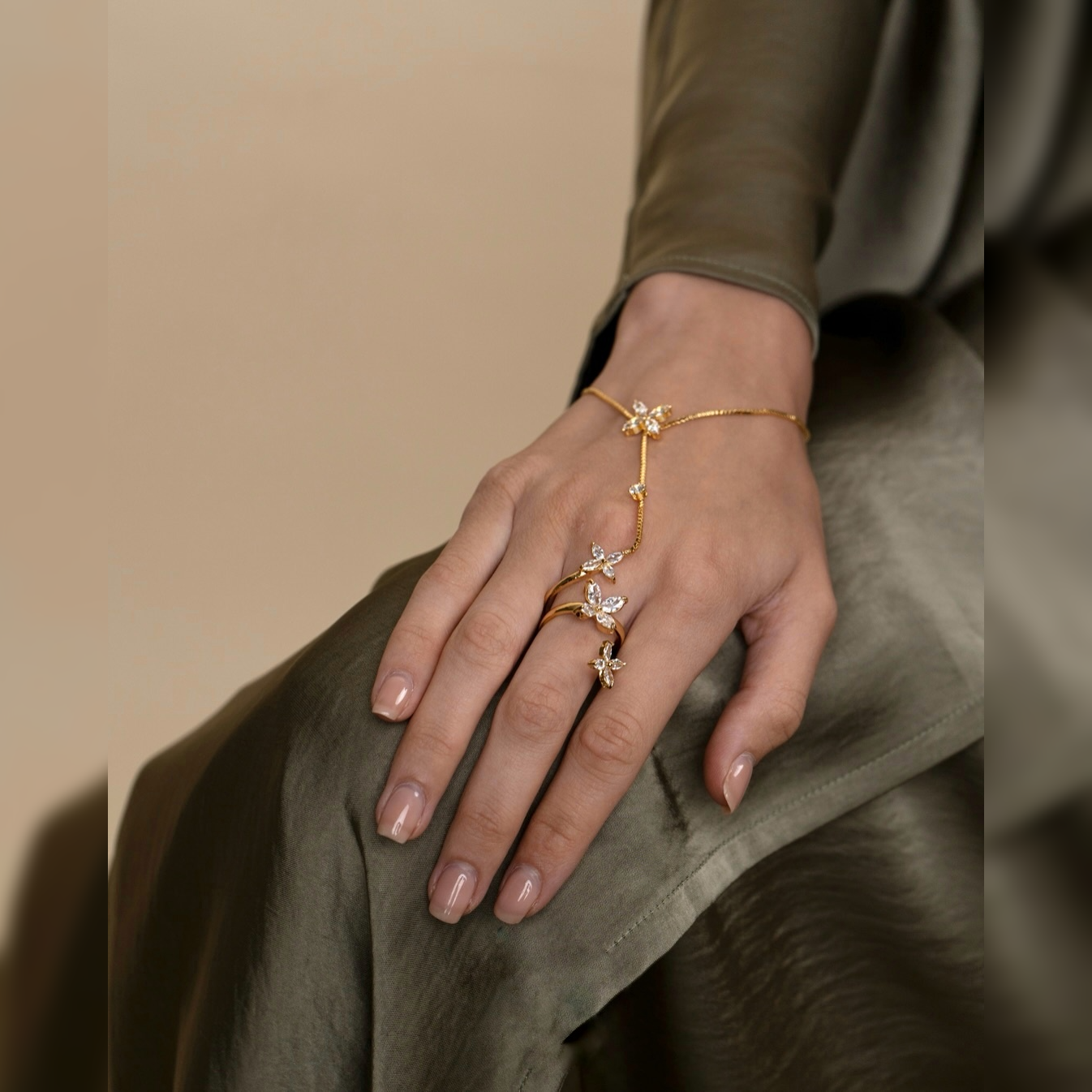 Embrace ethereal elegance with our Echo Flora Ringlet. This exquisite piece features a delicate chain that gracefully adorns your hand, connected to a ring adorned with sparkling floral motifs. Perfect for adding a touch of whimsical charm to any ensemble, this ringlet is a statement of refined femininity and unique style. Whether for a special occasion or to elevate your everyday look, let this be a whisper of delicate beauty on your hand.