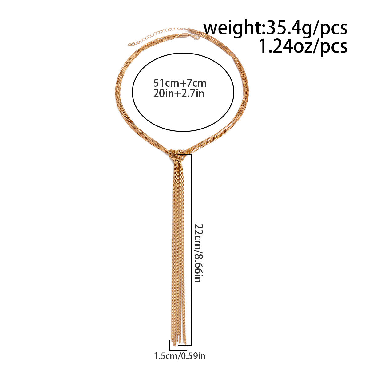 This elegant lariat-style necklace features multiple delicate gold-tone chains that converge into a stylish knot, from which a cascade of fringe-like chains drapes gracefully. Its versatile design allows for adjustable styling, making it a sophisticated statement piece perfect for adding a touch of glamour to any neckline.
