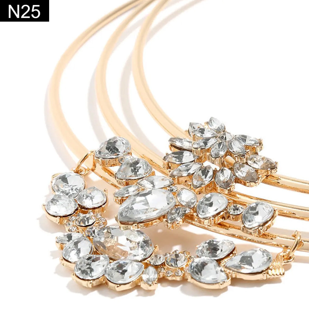 Empress Torque Necklace: Define your neckline with a powerful display of light and luxury. This striking necklace features three perfectly polished, graduated gold-tone metal bands that gracefully curve around the collarbone. Anchoring the bands is a magnificent central bib composed of brilliant, faceted crystals in various shapes, clustered together to create a dazzling floral motif. This structured, non-adjustable collar is the ultimate accessory for framing a simple dress or open neckline, instantly delivering red-carpet glamour and sophisticated brilliance.