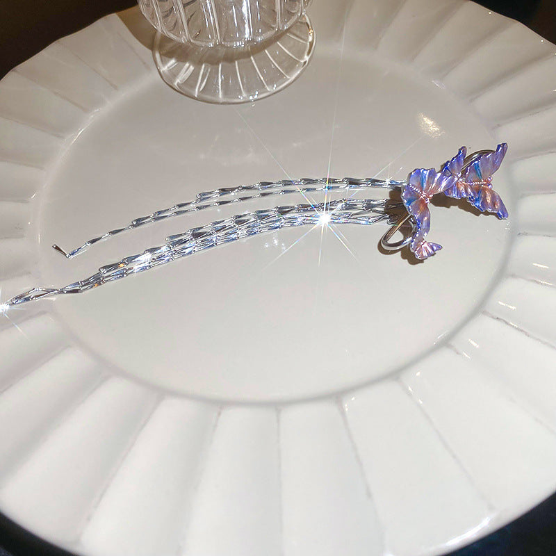 This is a striking and elaborate ear cuff featuring multiple delicate, iridescent butterfly motifs that appear to perch along the helix of the ear. From the bottom of the design, a long, shimmering cascade of fine silver-toned chains gracefully drapes down, creating a dramatic and elegant statement piece that combines whimsical charm with sophisticated sparkle.