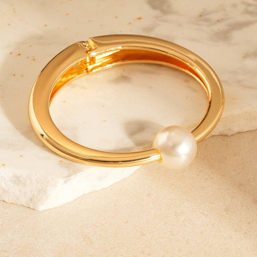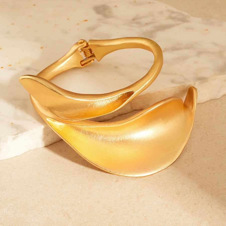 This is a breathtaking and luxurious set of multiple gold-toned bracelets, designed to be stacked together for a high-fashion, sculptural statement. The collection features a variety of textures and forms, including a wide, leaf-shaped cuff with a matte finish, a coiled, ribbed bangle, and two intertwined bangles adorned with a lustrous pearl and a brilliant faceted crystal. The set also includes a sleek, smooth-finished bangle, creating a stunning mix of organic shapes, classic elegance, and modern design.