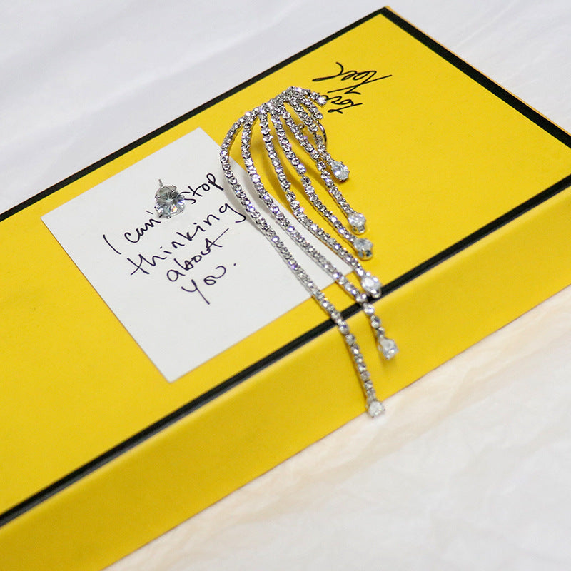 This elegant and dazzling drop earring features multiple graceful strands, each meticulously lined with sparkling clear crystals, creating a brilliant waterfall effect. The strands originate from a curved, crystal-encrusted base designed to hug the upper ear, with some strands terminating in larger, teardrop-shaped crystals, adding to its luxurious and fluid appearance. A matching small stud is part of a set for the other ear.