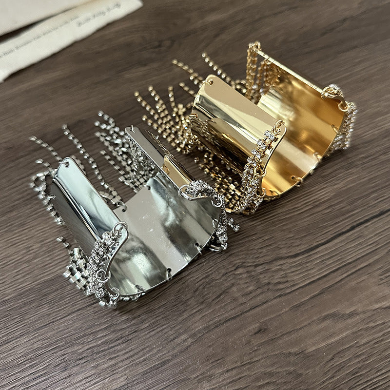 These bold and glamorous cuff bracelets feature a wide, polished metallic band in either luxurious gold or sleek silver. Draping elegantly from the lower edge are multiple strands of shimmering rhinestones in varying lengths, creating a dazzling fringe effect that catches the light with every movement. These statement pieces are perfect for adding a touch of red-carpet sparkle to any ensemble.