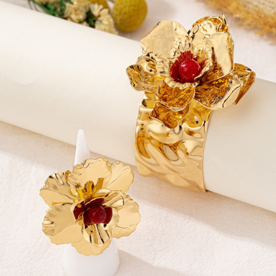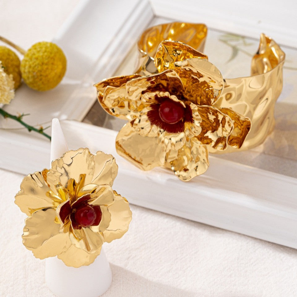 This striking set features a bold, oversized gold flower design, with a pearl at the center, presented as both a ring and a cuff bracelet. The textured gold petals create a dramatic, sculptural effect.