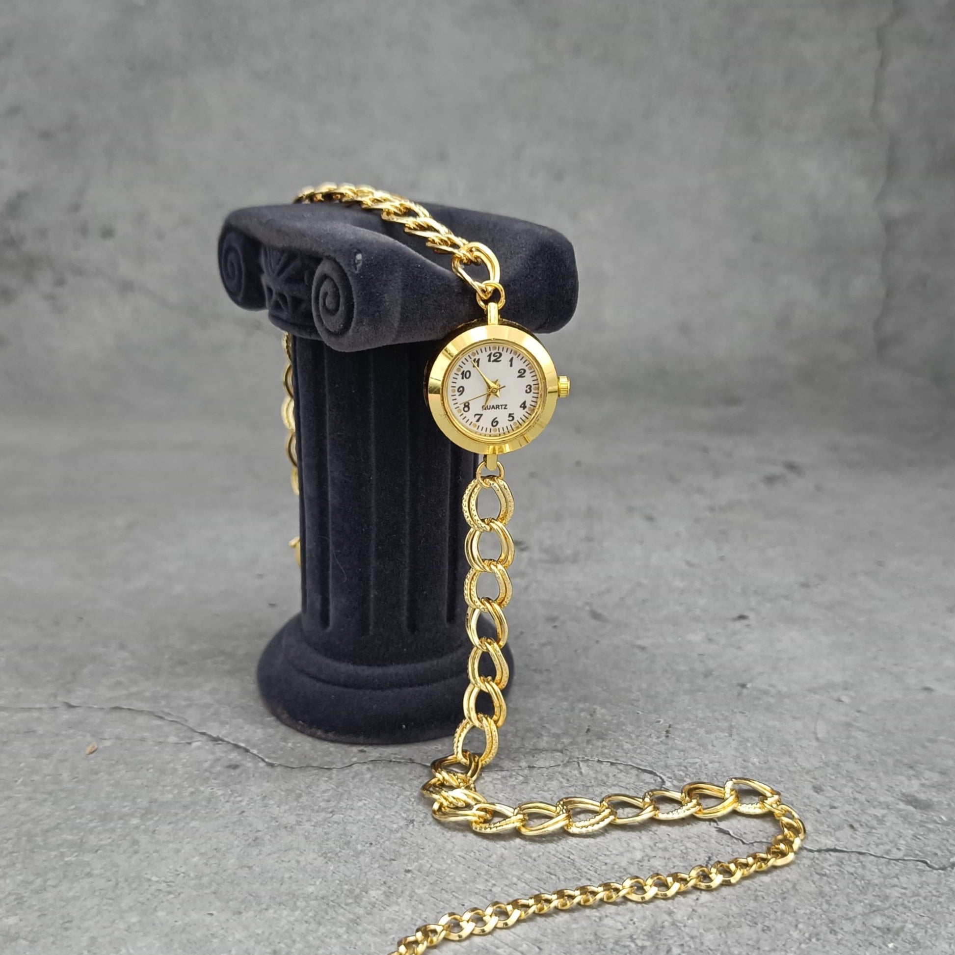 This striking choker features a gold-tone chain-link design with a central round watch face. The watch face is white with gold-tone hands and numerals, blending functionality with a fashionable, vintage-inspired aesthetic.