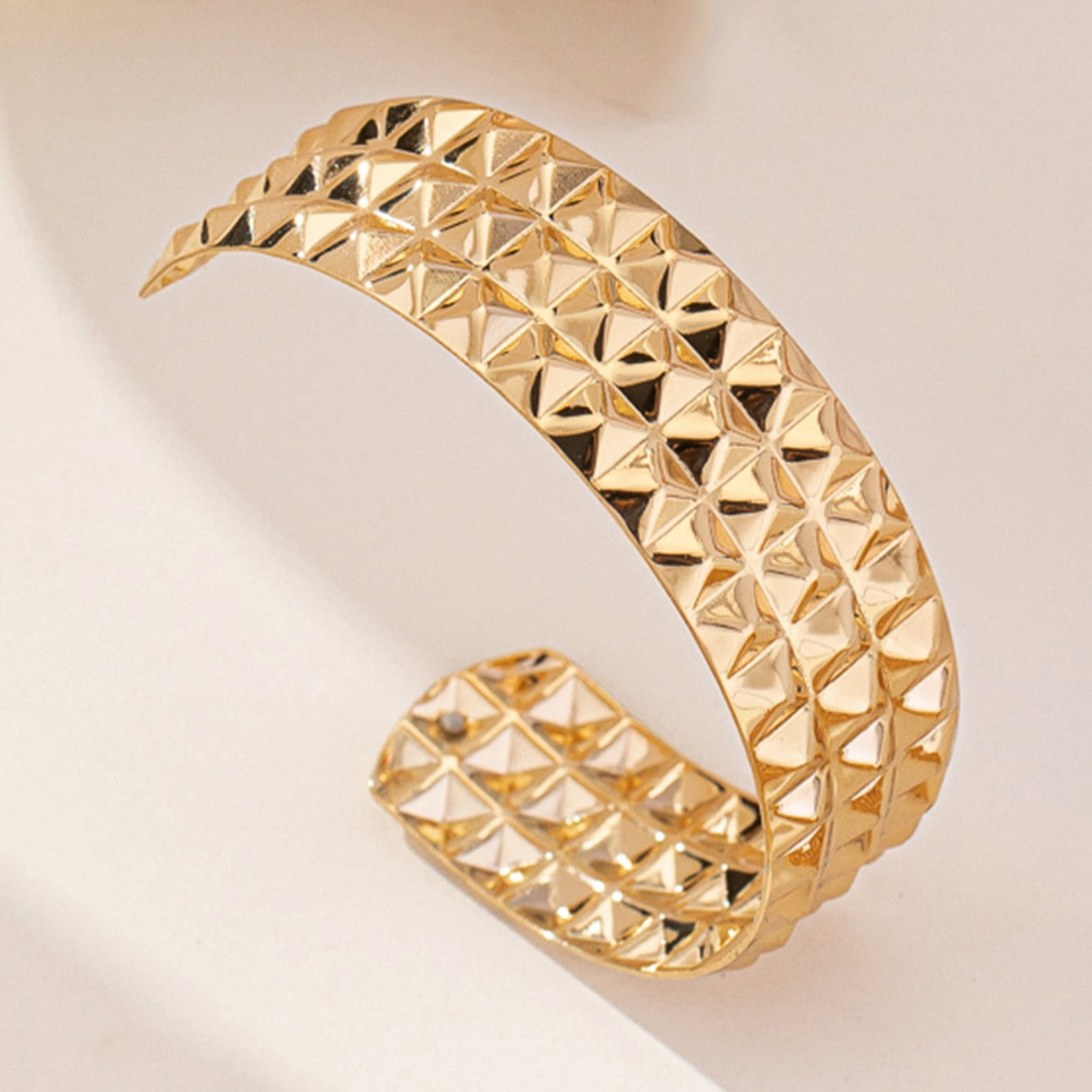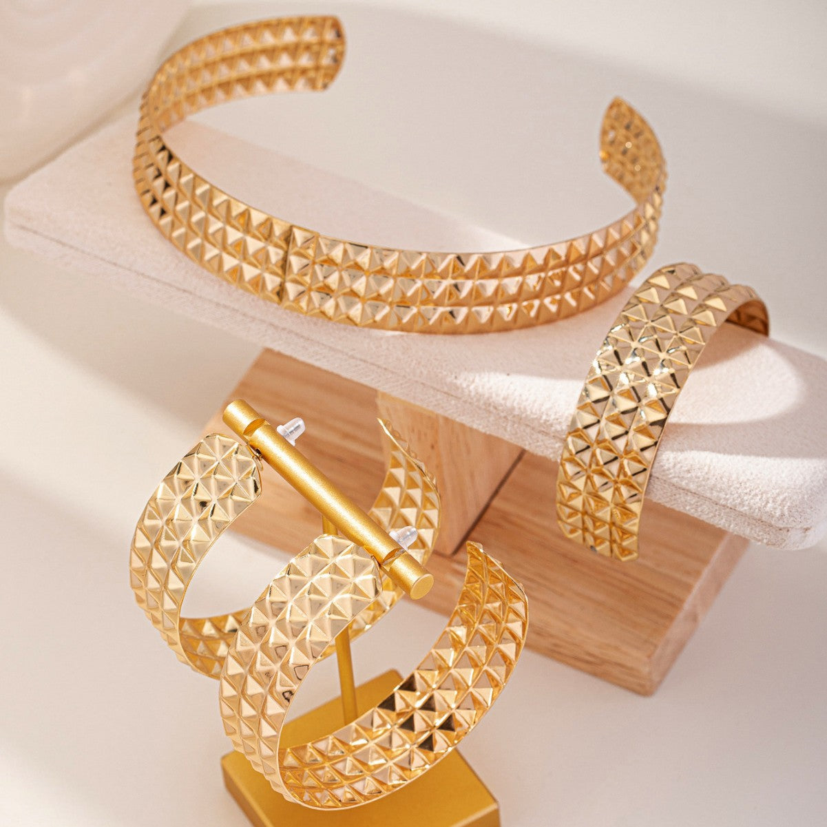 This stunning set features bold, gold-toned jewelry with a distinctive textured, pyramid-studded design. It includes a headband, a wide cuff bracelet and a pair of matching hoop earrings, all reflecting a modern, edgy aesthetic.