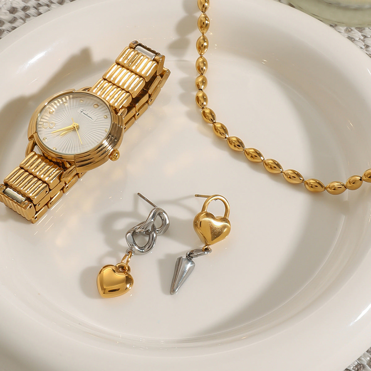 This mismatched earring set features a captivating contrast. One earring showcases a polished silver infinity knot from which a small, smooth gold heart dangles. The other earring presents a larger, textured gold heart suspended from a gold post, with a sleek silver spike pendant hanging below.