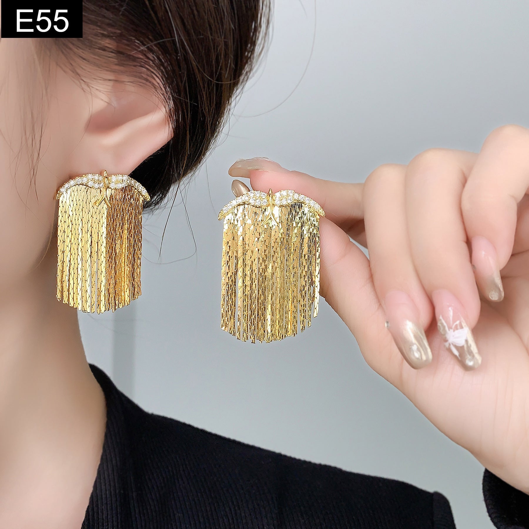 Majestic Wings Earring: A striking, textural accessory that defines modern glamour. This versatile piece, which can be worn as a brooch, scarf pin, or hair ornament, features a dense shield of textured metallic fringe that creates a fluid, heavy drape. The fringe is secured by a top band accented with a subtle, crystal-set star motif. Available in both brilliant silver and radiant gold finishes, this accessory adds an instant burst of dramatic, high-fashion movement to coats, blazers, sweaters, or updos. Wear the fringe, make the statement.