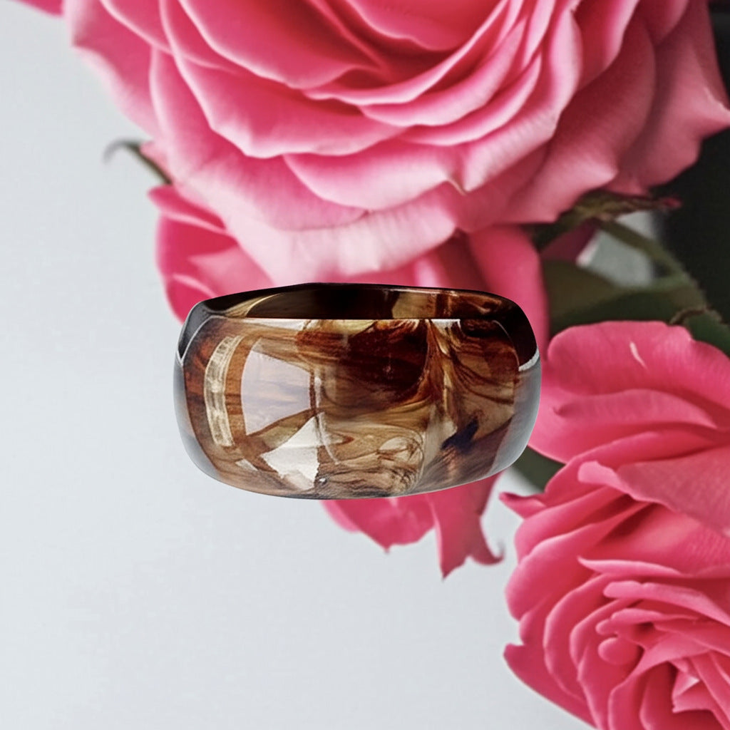 Stylish, wide cuff bracelets made from a smooth, polished resin or acrylic material. Each bracelet features a unique marbling or swirling pattern in distinct colors: a soft seafoam green, a creamy beige, and a rich, translucent brown. They exude a chic, contemporary, and versatile aesthetic.