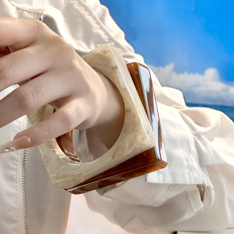 This collection features an exquisite range of resin bracelets, each showcasing distinct contemporary designs and sophisticated marbled patterns. From sleek square bangles in rich amber and creamy white to a striking triangular bangle and an elegant wide cuff, these pieces boast unique shapes and a polished finish. The subtle swirling textures mimic natural stones, offering a chic and artistic statement perfect for the modern minimalist or for adding an architectural accent to any outfit.