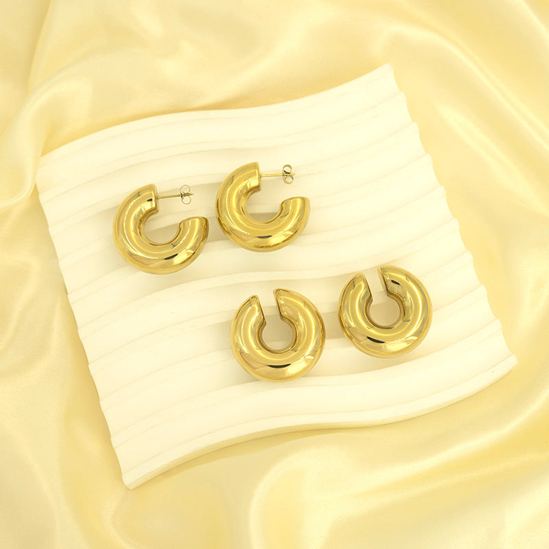 This bold and modern ear set features a striking combination of polished gold and silver-toned metals, designed with sleek, fluid, and organic shapes. The collection includes a substantial, curved earring that makes a statement, complemented by acoordinating ear cuff that gracefully hug the upper ear, creating an asymmetrical yet cohesive and contemporary look. The reflective surfaces catch the light, adding a touch of sophisticated gleam.