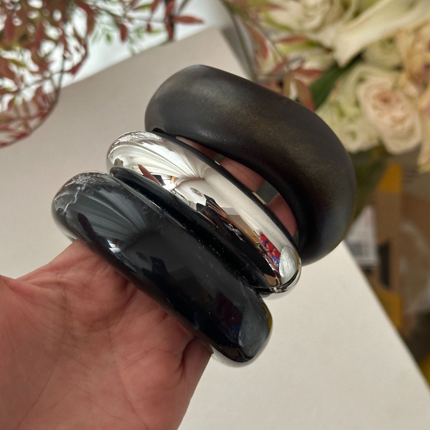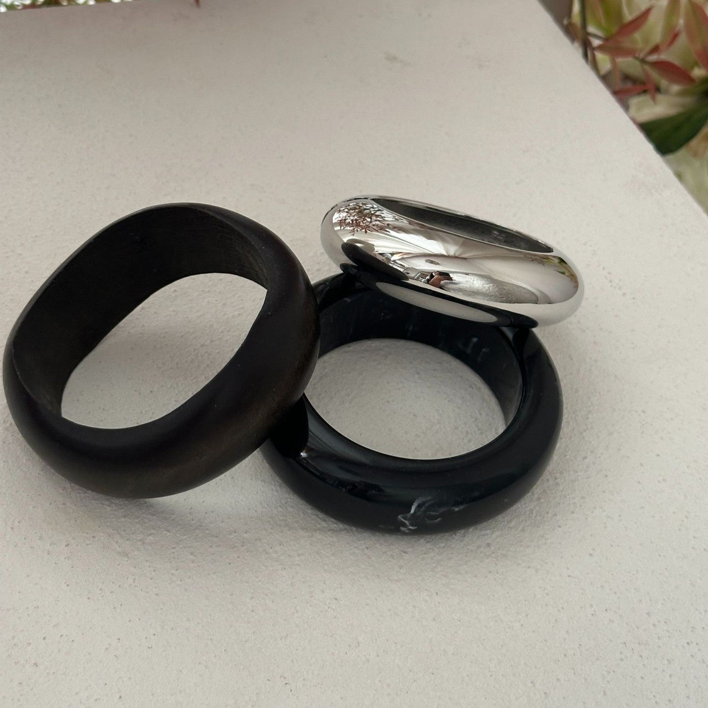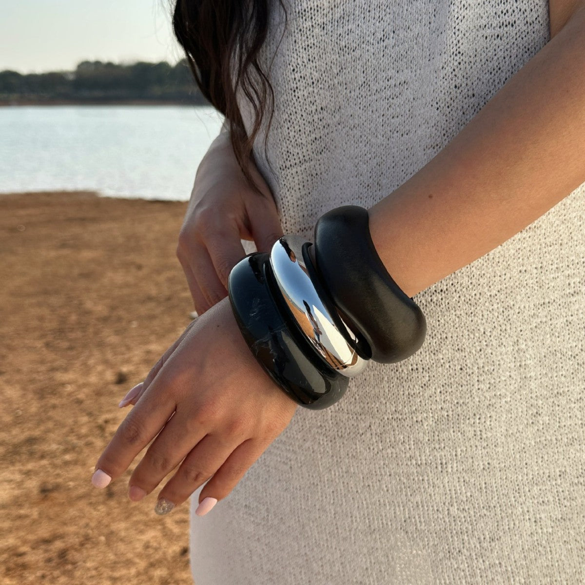This striking set of chunky bangle bracelets plays with contrasting textures and finishes. It features a wide, polished silver-toned bracelet, complemented by two rich, dark pieces – one with a matte wooden finish, and another with a sleek, glossy black appearance. Together, they create a modern, minimalist, and bold statement.