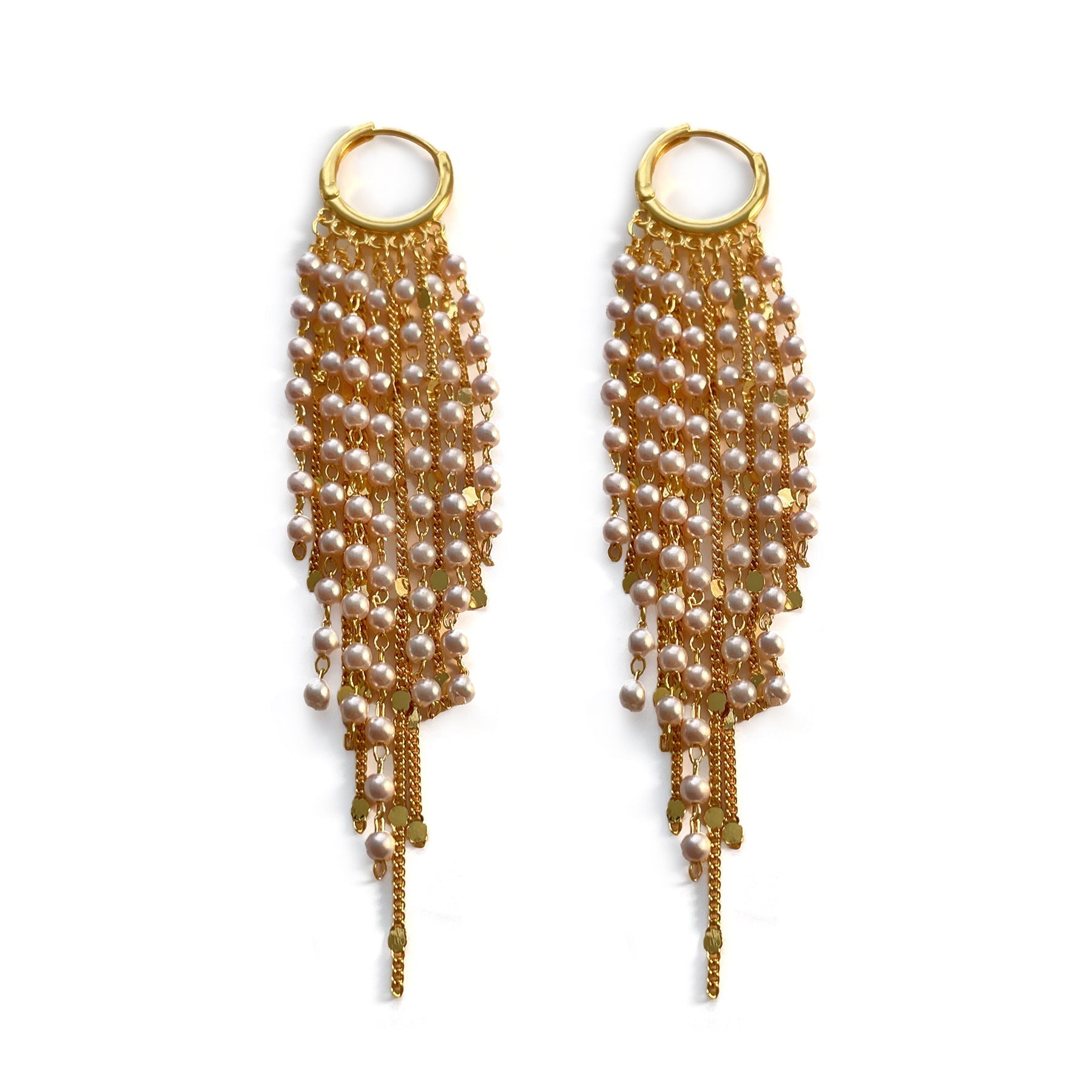These exquisite hoop earrings feature a luxurious cascade of delicate chains adorned with tiny, lustrous pearls and shimmering gold disks, creating a rich, multi-layered fringe. Their elegant design offers a sophisticated blend of classic pearls with a modern, bohemian flair, perfect for adding a touch of glamour and movement to any look.
