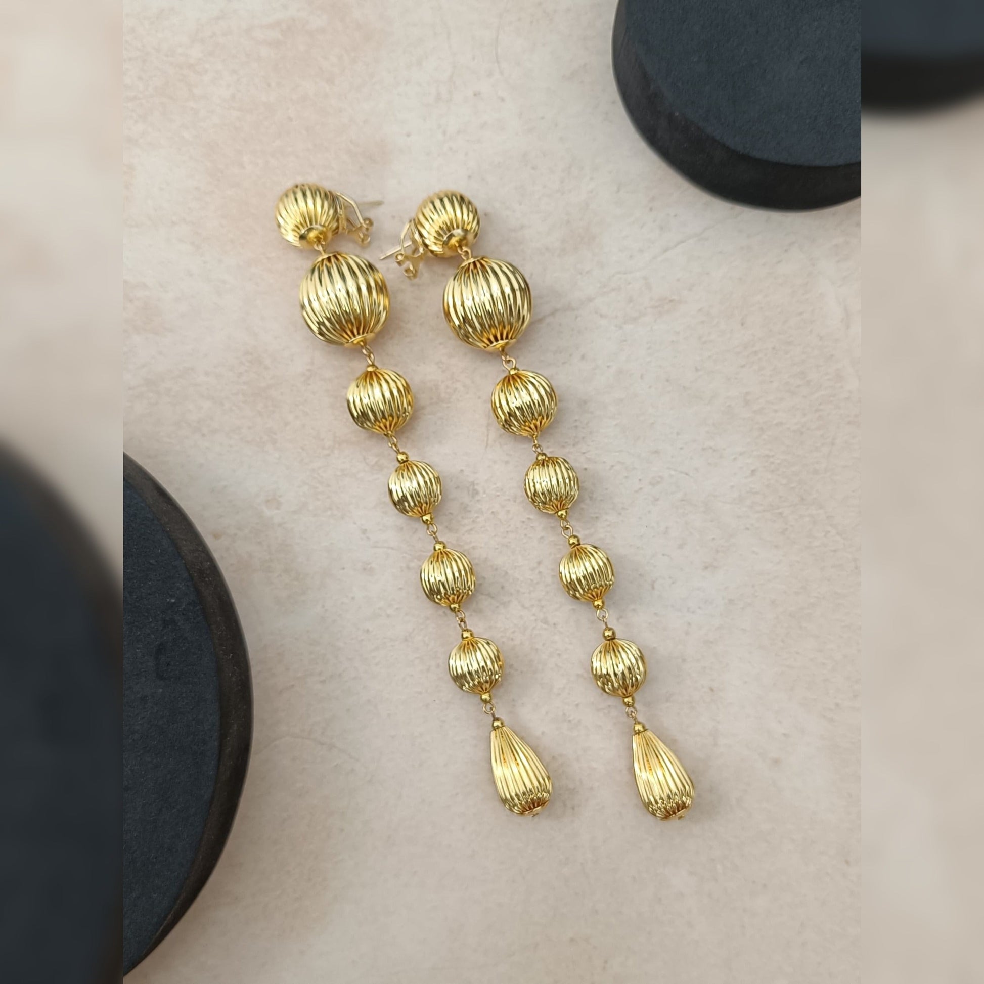 These stunning long dangle earrings showcase a cascade of ribbed, gold-tone beads, each connected delicately for a seamless flow. The graduated design leads to a teardrop-shaped bead at the bottom, adding an elegant charm. Perfect for festive occasions, weddings, or as a bold statement piece to elevate any outfit.