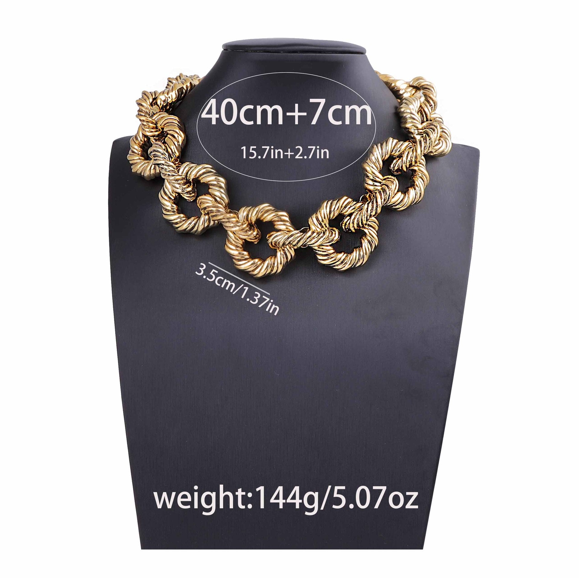 This bold and luxurious jewelry set features chunky, intertwined golden links, creating a statement-making necklace and matching bracelet. The links have a rich, textured appearance, giving the pieces a substantial and opulent feel, perfect for adding a touch of glamour to any outfit.